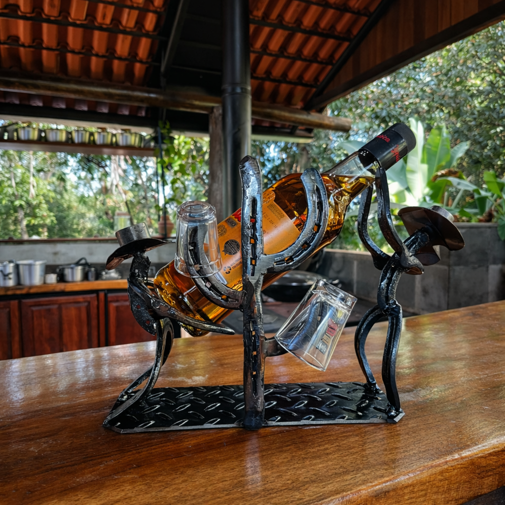 O Suporte de Garrafa em Ferraduras não foi criado apenas para segurar uma bebida. Ele foi feito para fazer parte do cenário onde a conversa acontece